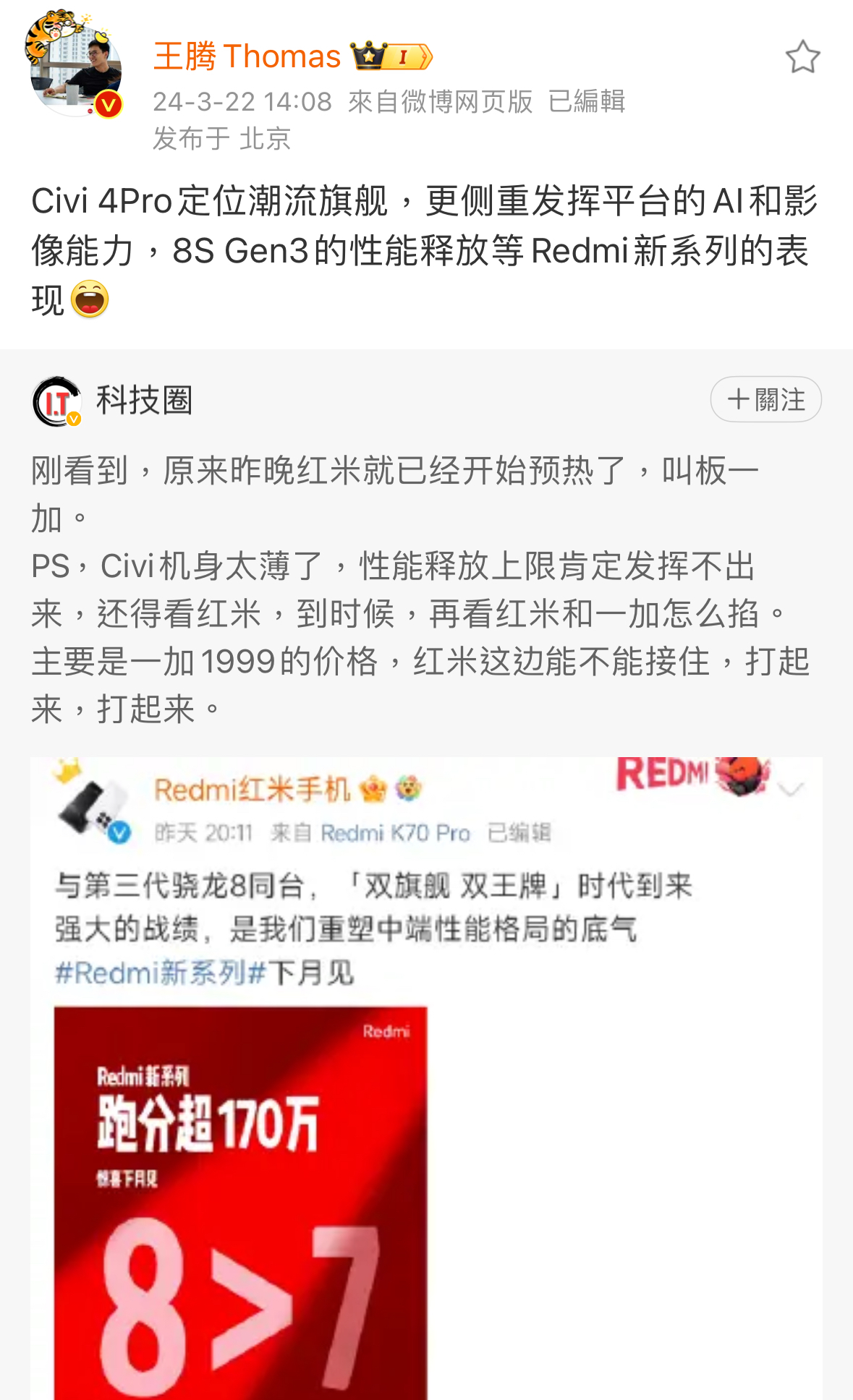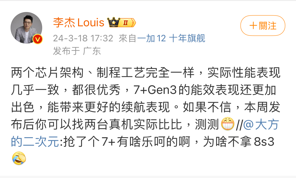 其实也可以理解,Redmi要开一条新产品线主推旗舰性能中端手机,而一加却在宣传8s Gen 3和7+ Gen 3两款芯片表现相当,后者在某些部分表现还更好,自然让王腾坐立不安。