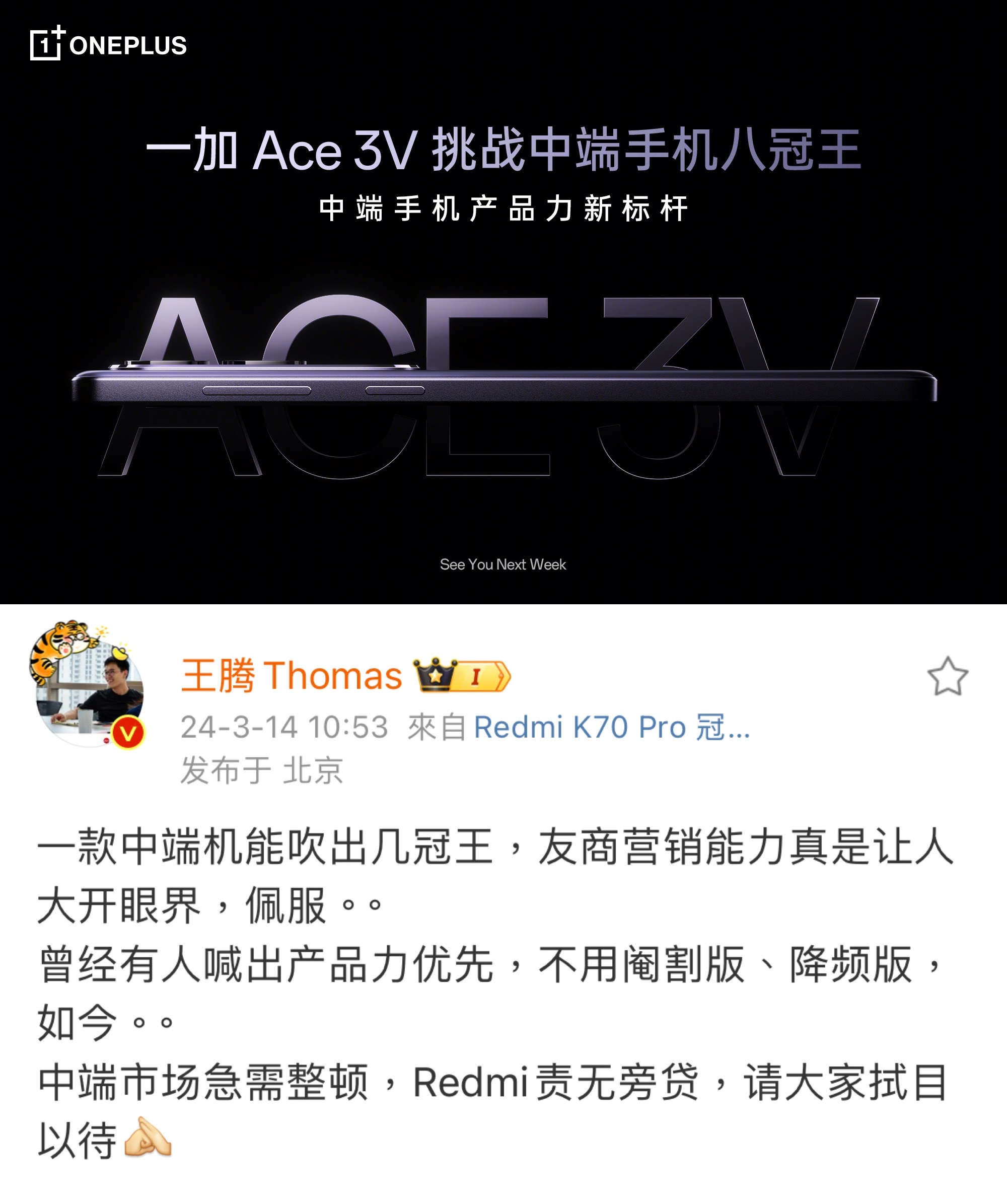 一加手机总裁李杰在早期的预热海报中宣称:一加Ace 3V是中端手机八冠王。随后,Redmi手机负责人王腾就在个人社交平台里隔空回应道“一台中端还能吹出几冠王,友商的营销能力真是让人佩服”。