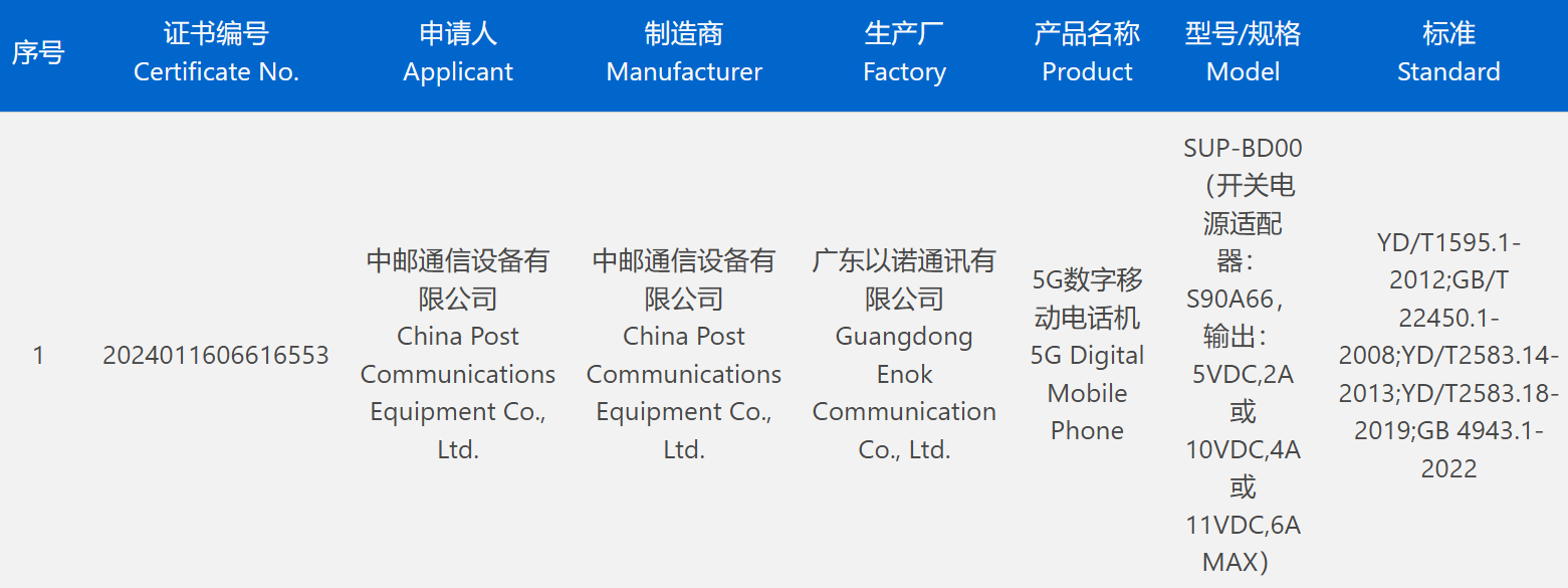 认证显示,这款新机申请人为中邮通信设备有限公司,生产厂为广东以诺通讯有限公司,是一款“5G 数字移动电话机”,支持 66W 有线快充。具体输出为:5VDC,2A 或 10VDC,4A 或 11VDC,6A MAX。