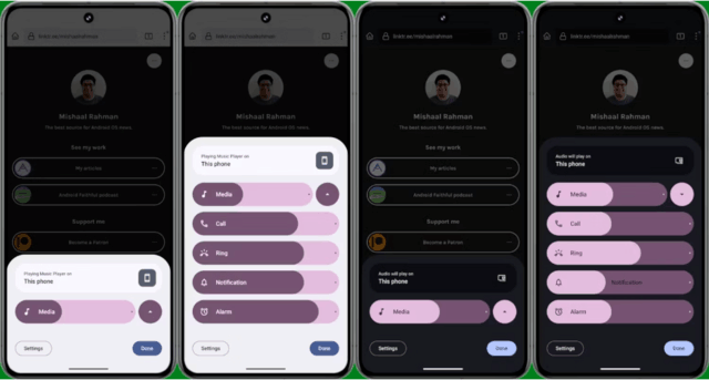 根据信息挖掘人 Mishaal Rahman 的发现,Android 15 的音量面板采用了全新设计的滑块形式,由细长条变成了粗长条,并且支持一键静音功能。只有当设备上有内容正在播放时,媒体滑块才会显示出来;而如果没有媒体播放,则会显示所有五个控件。每个滑块的末尾都带有一个点,用来指示每个选项的最大音量。