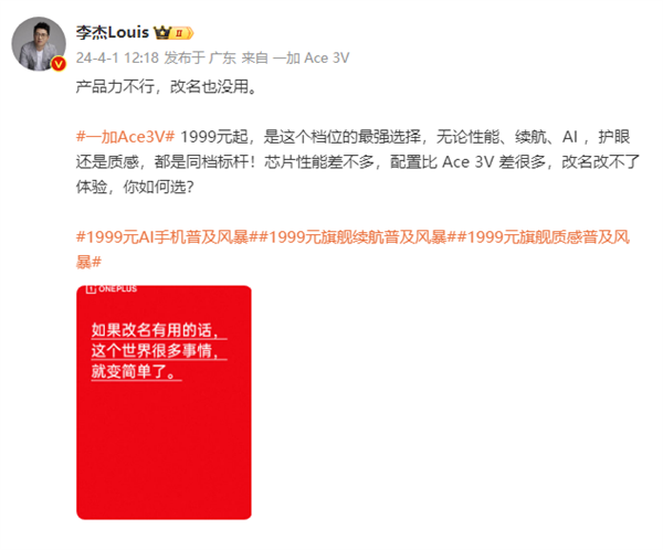 快科技4月1日消息,今天一加中国区总裁李杰在个人微博上表示,手机改名改不了体验,产品力不行,改名也没用。