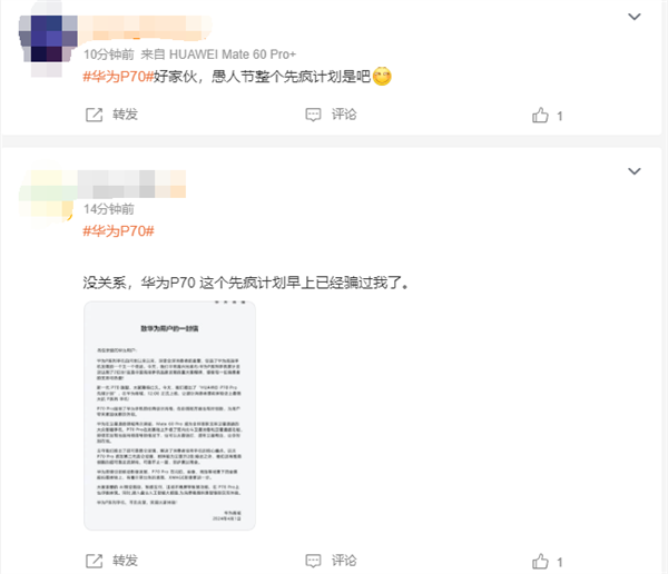 值得一提的是,华为P70最近多次登上微博热搜,但点开一看却与新机开售没有一点关系,网友们纷纷调侃华为P70让大家都变成了“先疯计划”。