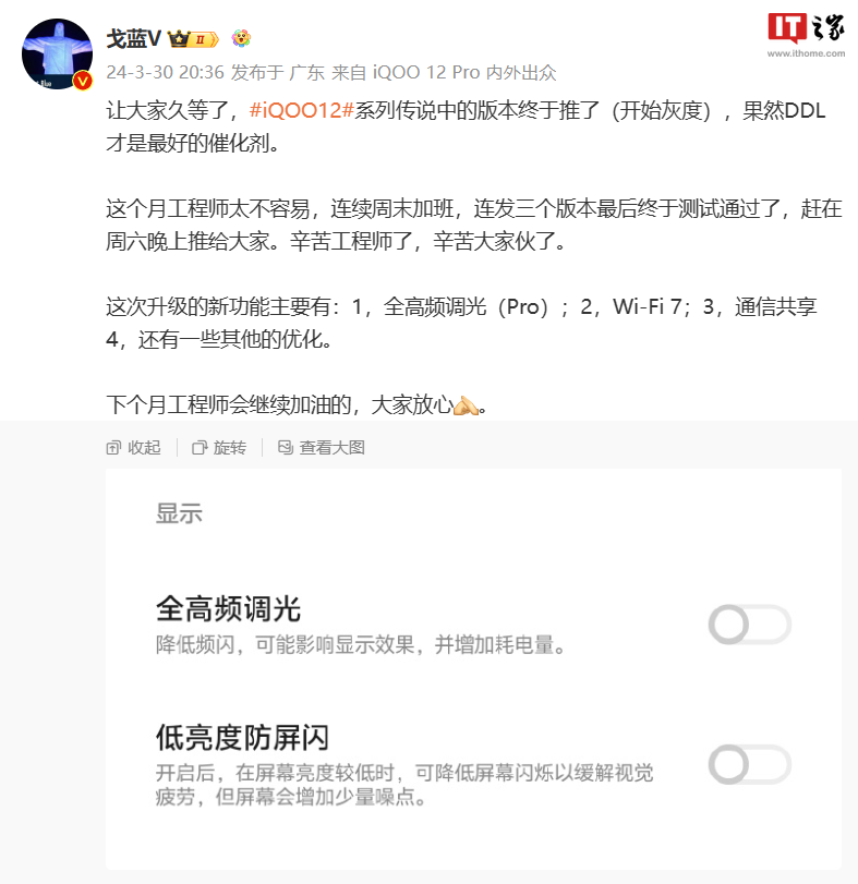 文章来源于互联网:IT之家-iQOO 12 系列手机更新支持全高频调光、Wi-Fi 7、通信共享,即将升级 5.5G