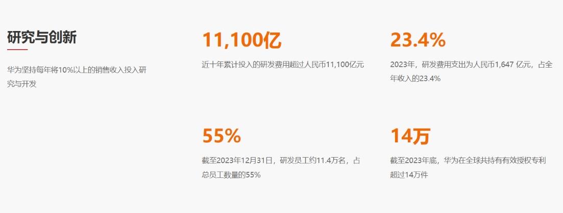 官方公布的数据显示,华为近十年累计投入的研发费用超过人民币11,100亿元,坚持每年将10%以上的销售收入投入研究与开发。