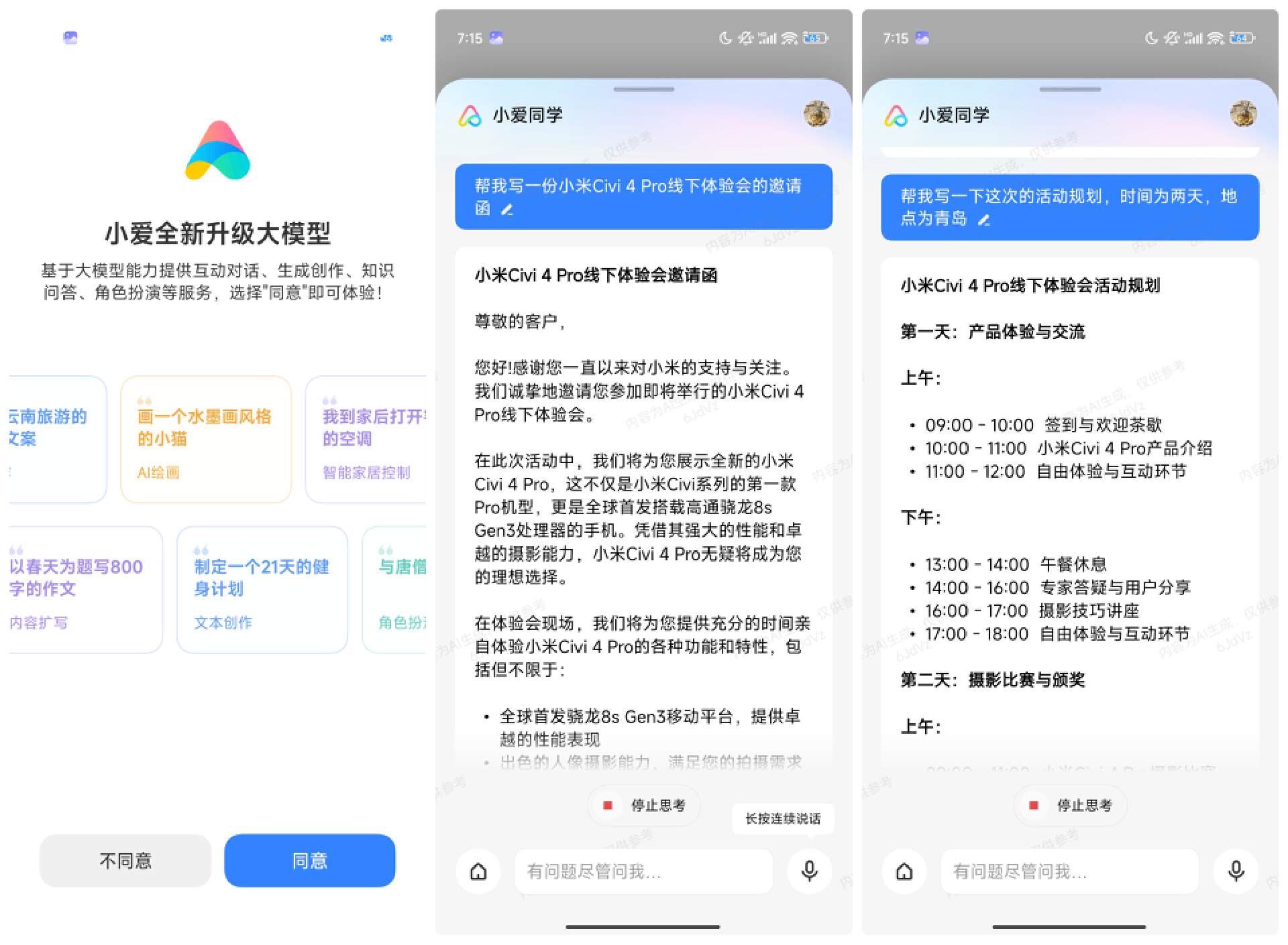 笔者让小爱同学帮忙写一份小米 Civi 4 Pro 的线下体验会邀请函和活动规划,把需求发给小爱同学后,几秒钟便自动生成一段文字内容。对于文字工作者来说,这真可谓彻底解放生产力了。