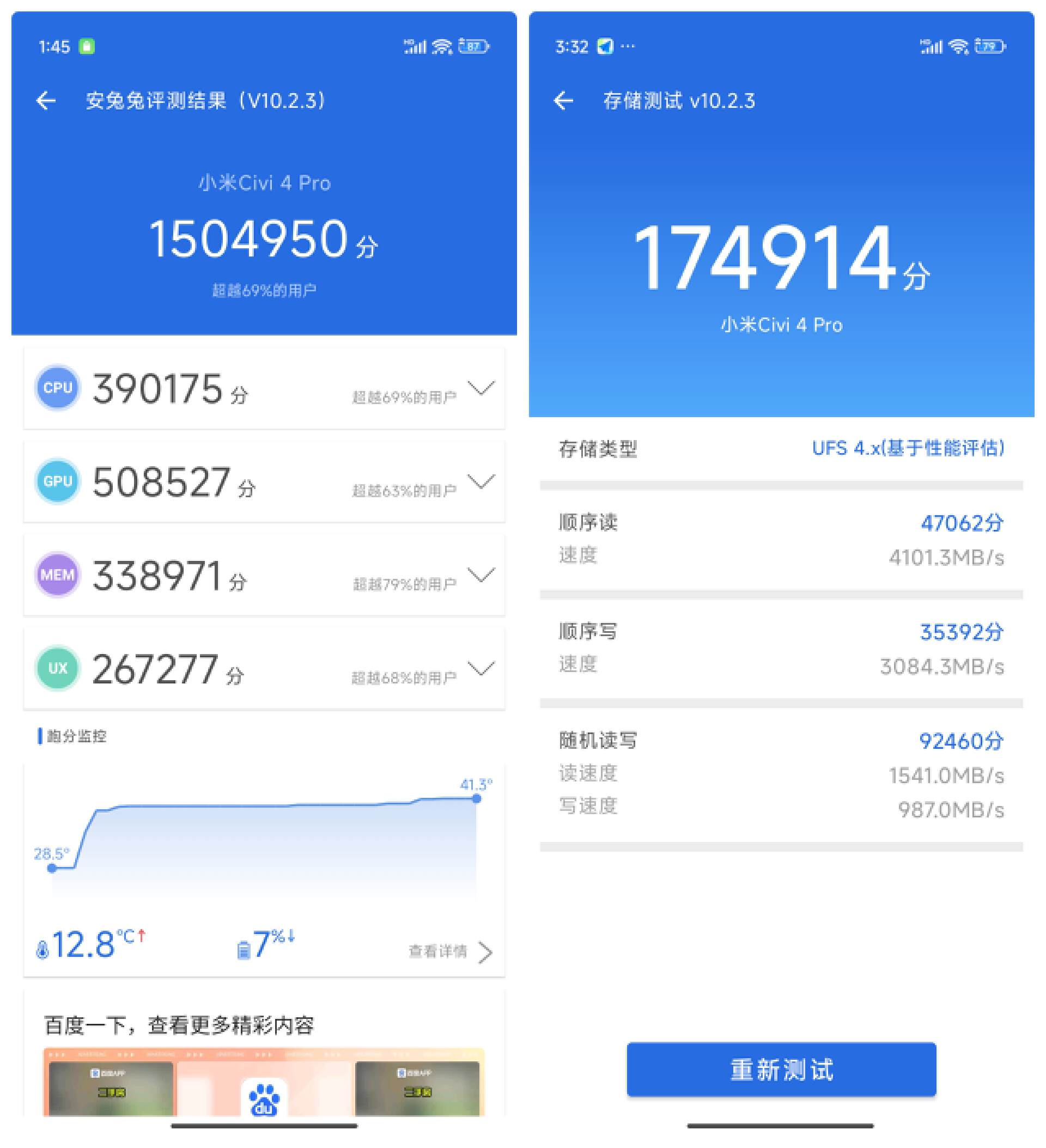 安兔兔的存储测试方面,小米 Civi4 Pro 拿下 17.4 万 + 的分数,其中顺序读取速度达到了 4101.3MB/s,妥妥的 UFS 4.0 标准。