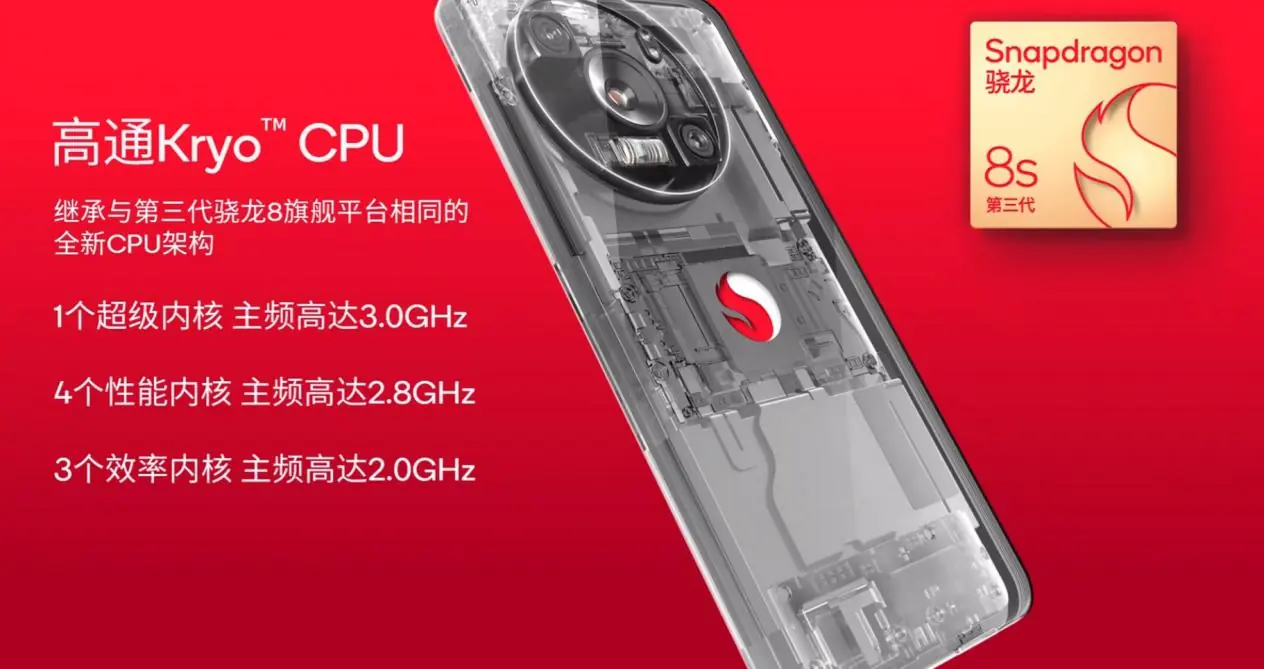 第三代骁龙 8s 平台的 Kryo CPU,包含一个主频为 3.0GHz 的超级内核、4 个主频高达 2.8GHz 的性能内核和 3 个主频为 2.0GHz 的效率内核,从 IP 层面,它继承了和第三代骁龙 8 旗舰平台相同的 CPU 架构,可以游刃有余地处理各种重载和日常任务,实现出色的性能和功耗平衡。