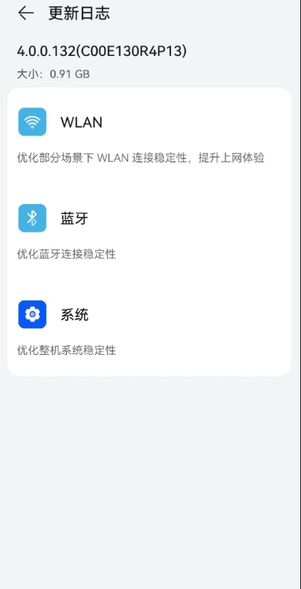 根据升级日志显示,此次更新主要针对网络、蓝牙、系统三方面进行优化。