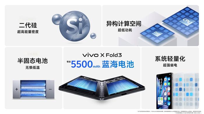 续航方面,vivo X Fold3 系列配备等效 5500mAh 和等效 5700mAh 新一代蓝海电池双双突破折叠屏电池容量上限,创新采用二代硅材料,微米级激光阵列刻蚀技术,以及手机行业率先发布的半固态电池技术,低温也能长续航。