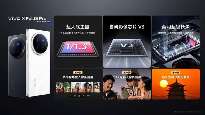vivo X Fold3 系列全面拉齐 X100 系列影像实力,vivo X Fold3 Pro 搭载了蔡司全焦段专业影像系统,包括采用了蔡司 T * 镀膜技术的超感光 VCS 仿生大底主摄、蔡司超级长焦和超视野超广角摄像头,再现 vivo X100 Pro 的长焦悬日、长焦微距等典型场景,还支持 24mm、35mm、50mm、85mm 和 100mm 五大人像黄金点位的蔡司全焦段人像大师,配合全新蔡司人像风格滤镜,带来丰富多样且极具质感的影像体验。同时,vivo X Fold3 Pro 还搭载了 vivo 自研的 6nm 影像芯片 V3,实现折叠屏人像视频进入 4K 时代。