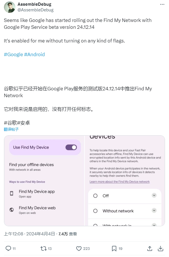 在最新的Google Play测试版v24.12.14中,Android专家AssembleDebug发现,谷歌正在为部分安卓手机用户测试一项名为“查找离线设备”的新功能,这表明谷歌正在积极推进其“查找我的设备”网络。根据发现,这项新功能可以查找离线或在线设备,默认情况下会自动开启并设置为“所有区域”,用户也可以手动选择完全禁用该功能。