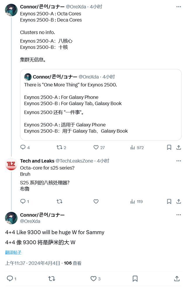 IT之家 4 月 4 日消息,消息源 @OreXda 近日发布推文,表示三星正在积极测试 Exynos 2500 芯片,目前共有 8/10 两个版本,只是不清楚具体的组合配置情况。