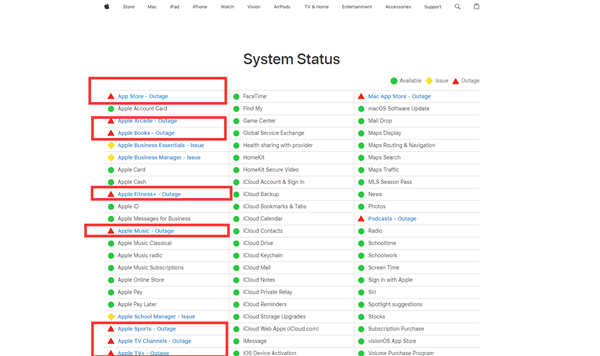 在苹果官网查询服务器状态后得知,除App Store外,Apple Arcade、Apple Books、Apple Fitness+、Apple Music、Apple Sports、Apple TV+等也都中断了服务。