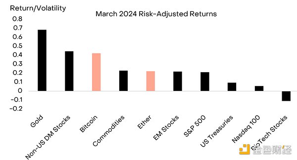 除比特币和以太坊以外,许多传统资产在 2024 年 3 月也取得了正收益。从风险调整后的基准来看(即考虑到每个资产的波动性),比特币的表現处于较高水平,而以太坊的收益则更接近中间位置(图表 2)。