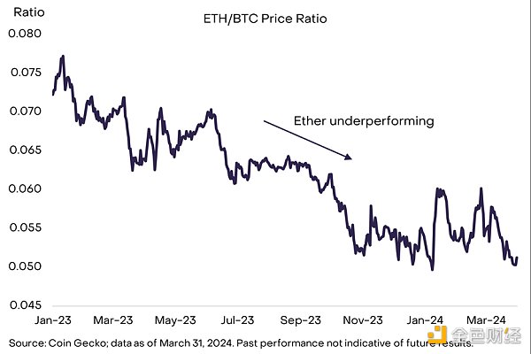图表 5:尽管进行了重大网络升级,但以太币的表现仍落后于比特币
