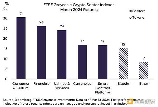 灰度公司制定了灰度加密子行业 (Grayscale Crypto Sectors) 的概念,这是一个将加密资产类别划分为五个不同子行业的综合框架,投资者可以利用它追踪除比特币和以太坊之外的加密领域活动。从加密子行业的角度来看,3 月份表现最好的细分市场是“消费 & 文化”,反映了“迷因币”的高回报率(图表 6)。[8] 迷因币反映了互联网文化,在加密领域,迷因币相关的代币主要用于娱乐目的进行交易;这些项目的历史上既没有产生收入,也没有切实的用例(例如支付),因此应该被视为非常高风险的投资。话虽如此,柴犬币 (Shiba Inu) 的开发人员(按市值计算,它是消费 & 文化加密子行业中第二大迷因币)试图通过推出一个以太坊 L2 来扩大该项目的范围,该 L2 运行着去中心化金融 (DeFi) 活动。[9]