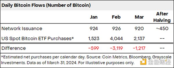 尽管比特币创下历史新高,但随着交易者减仓以及美国上市现货比特币 ETF 的流入放缓,它也经历了月中约 13% 的回调。[4] 整个 3 月份,美国上市现货比特币 ETF 的净流入总计 46 亿美元,低于 2 月份的 60 亿美元。[5] 现货比特币 ETF 的净流入量虽然低于上个月,但仍远高于比特币网络的发行量。据我们估计,按比特币计算,这些美国 ETF 在 3 月份每天购买约 2,100 枚比特币,而同期网络每天的发行量约为 900 枚(图表 4)。[6] 4 月份减半后,网络发行量将降至每天约 450 枚。