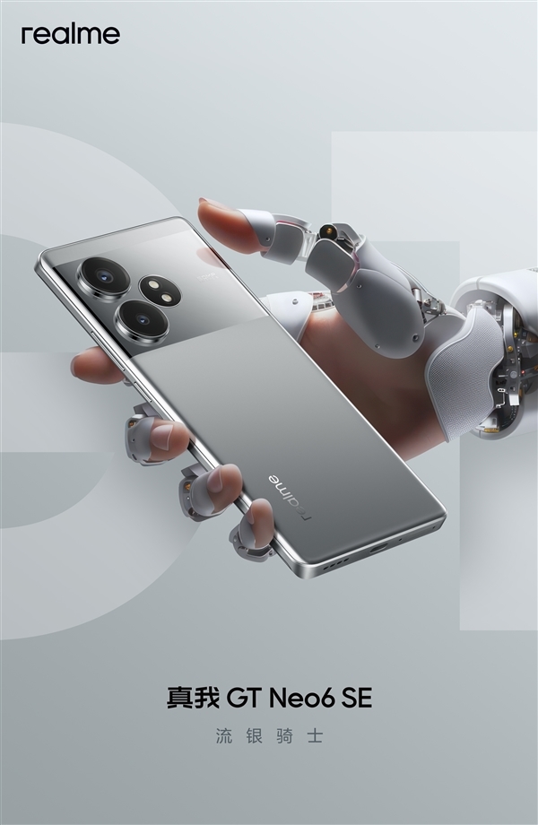 据介绍,真我GT Neo6 SE采用了全新的配色方案——流银骑士,呈现出液态金属的质感,设计简约而高级,表面采用了光哑设计,增添了层次感。