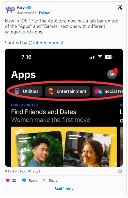 苹果以前为 Apple Arcade 提供了这种顶部栏导航选项,现在进一步扩展到 App Store 其它部分中。
