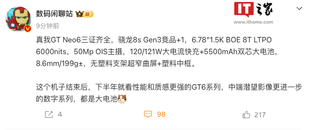此外,博主 @数码闲聊站表示,realme 真我 GT Neo6 手机发布后,下半年将发布的 GT6 系列和数字系列手机,前者将有更强大的性能和更好的质感,后者将让中端潜望影像更进一步。