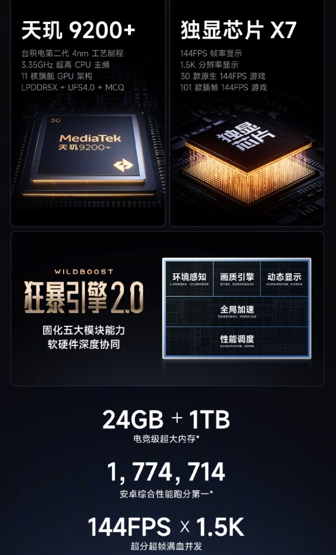 Redmi K60 至尊版搭载联发科天玑 9200+ 旗舰处理器,配有 Pixelworks 逐点的 X7 独显芯片,最高 24GB LPDDR5X 内存和 1TB UFS 4.0 闪存,还搭载了全新的狂暴引擎 2.0。
