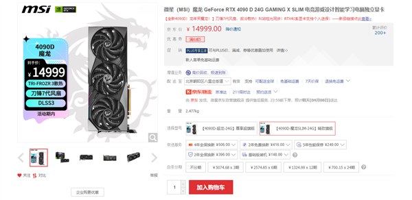 微星官网上已有三款RTX 4090D上架,但在京东上仅有超龙(15999元)和魔龙(14999元)两款型号可购买。