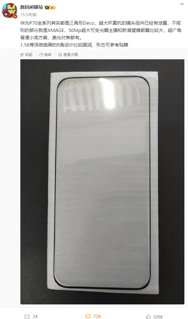 日前,数码博主“数码闲聊站”透露,华为P70全系都是三角形后摄Deco,超大杯镜头不规则部分为XMAGE。