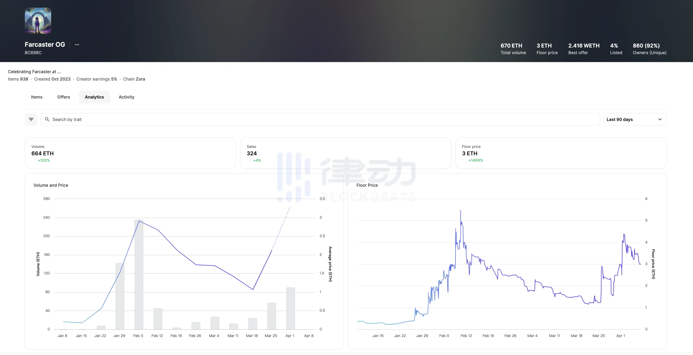 而提到 Base 上的 NFT,就不得不提到 Zora 这条专为艺术打造的 L2,其和 Farcaster 协议的绑定也很紧密。Zora 上的 NFT 活动更是不胜枚举,甚至被社区誉为「纯消费链,就是来这花钱的」。二月那一波 Farcaster fomo 浪潮时 Farcaster OG NFT 系列创下历史新高,近期随着行情高涨地板价也再次超过了 4ETH。