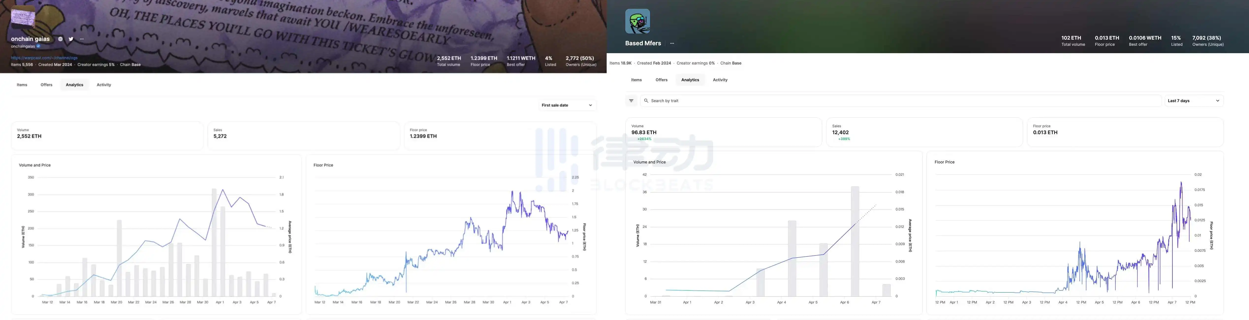 Base 上的 NFT 大多起源于 Warpcast 上的 Frame,得益于低费用交互简单,很多 NFT 集合的生命周期都较为短暂。而 onchain gaias、Based Mfers 等稍早前推出的 NFT 目前的价格表现也值得关注。Base 协议负责人 Jesse 的「喊单」也是决定这些 NFT 是否出圈的关键因素。