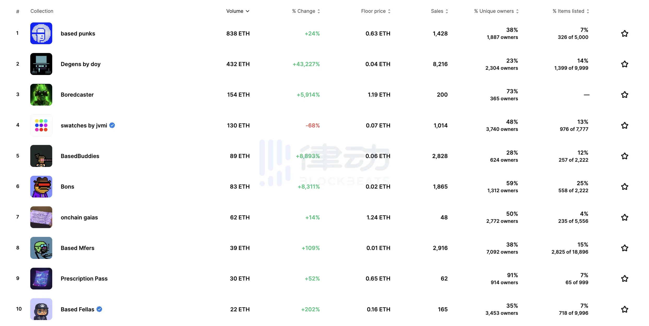 假期里,Base 的 NFT 表现十分亮眼。以 based punks、Degens by doy、BasedBuddies 为首的新上线 NFT 在 Opensea 上交易十分活跃,based punks 价格自开盘 0.018ETH 左右最高上涨至接近 0.9ETH。