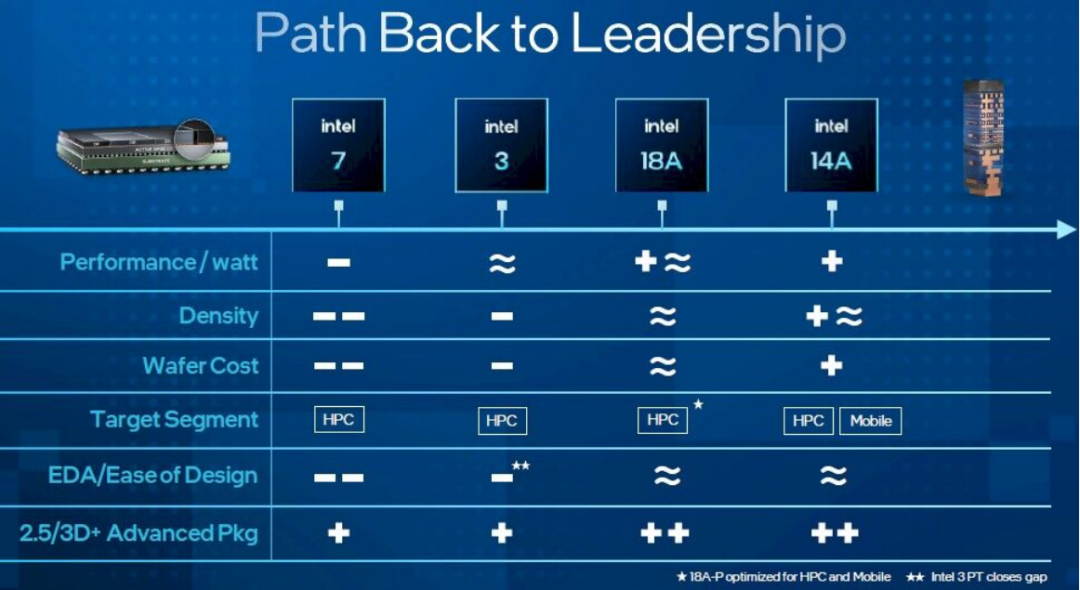 这就是Gelsinger所说的图,它列出了Intel 7(10纳米)和Intel 3(5纳米)工艺的竞争格局,没有提到20A(2纳米)工艺,直接跳到1.8纳米和1.4纳米工艺:
