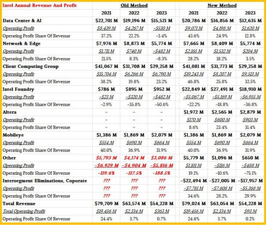 在英特尔代工旧方法中,英特尔只是谈论其制造产能的对外销售。使用新方法,从每个组中提取芯片制造的公平市场价格,并结合其他成本计算每个组的新营业利润。正如我们所看到的,所有主要集团的利润都增加了,Altera 和 Mobileye 基本没有变化。