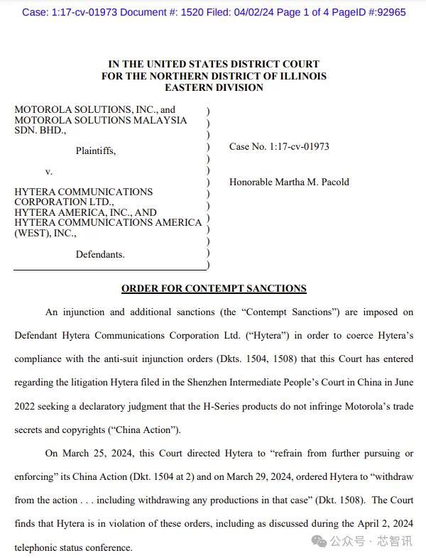 根据海能达官网提供的美国伊利诺伊州北区地方法院所出具的法令原文显示,因海能达未遵守法庭要求其退出并撤回其在2022年6月向深圳市中级人民法院提起的诉讼(该诉讼寻求其旗下 H 系列产品不侵犯摩托罗拉商业秘密与版权的宣告性判决),下达蔑视法庭制裁令。