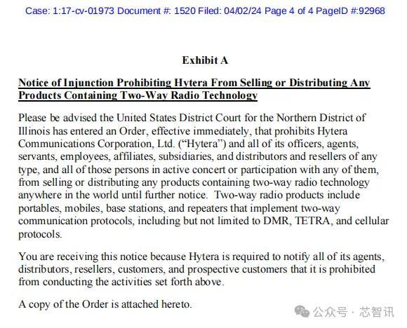 此外,海能达应在本禁令生效后的三个日历日内,通过在其网站主页和其销售任何双向无线电产品的任何页面(包括海能达维护网站的任何地区或语言的所有页面,以该地区的语言)的显著位置张贴以下通知来宣传本禁令的生效:“公告:根据美国法院的命令,在另行通知之前,禁止海能达在世界任何地方销售任何含有双向无线电技术的产品”,并附有本命令副本的链接。