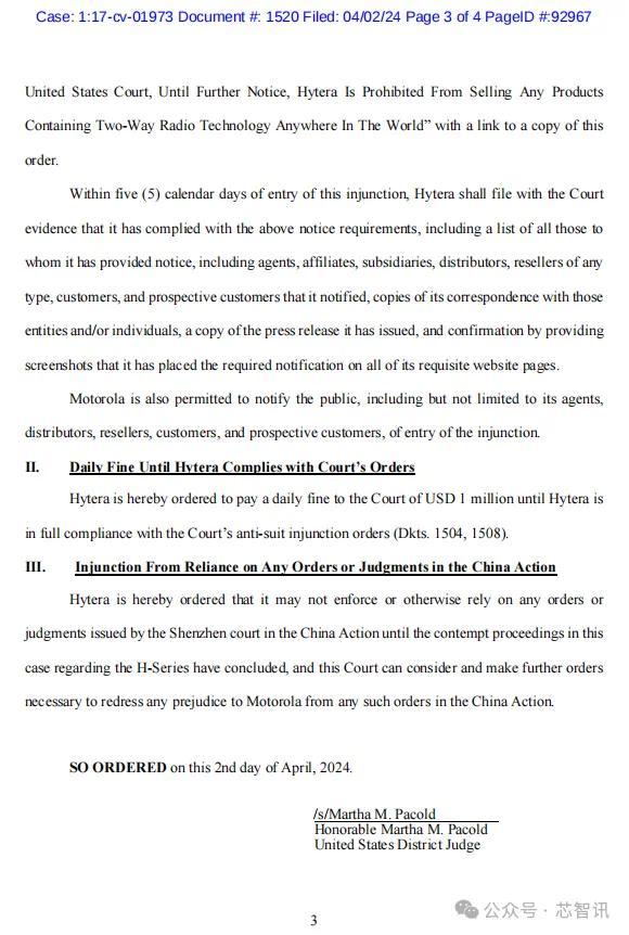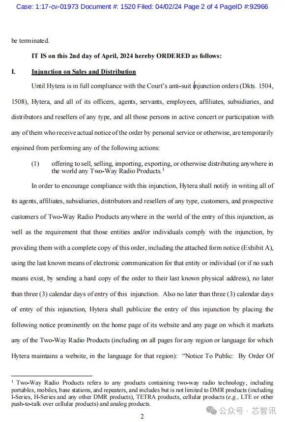 在海能达完全遵守美国伊利诺伊州的北部联邦地区法院的反诉讼禁令(Dkts.1504、1508)之前,海能达及其所有高级职员、代理人、雇员、附属公司、子公司、分销商和转售商,以及所有通过个人服务或其他方式收到命令实际通知的与其积极合作或参与的人员,被暂时禁止执行以下任何行为:
