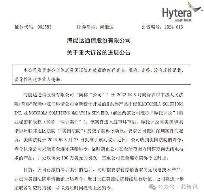 4月8日早晨,海能达发布公告针对该禁令回应称,“公司已撤销深圳案件的起诉,同时按要求暂停销售双向无线电技术产品, 并已向美国法院申请撤销上述判令,近日正在美国法院持续进行听证。公司将进一步采取各项应对措施,争取最短时间撤销上述判令。”