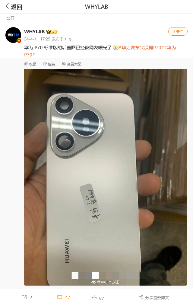 文章来源于互联网-华为 P70 标准版手机背面照片曝光,三角形相机岛设计