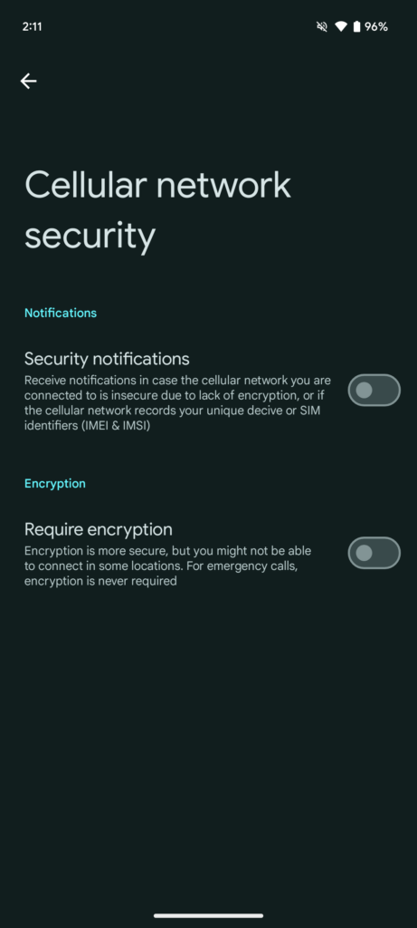 除此之外,Google还为蜂窝网络引入了一套新的保护隐私的功能。您可以在设置 > 安全和隐私 > 更多安全和隐私 > 蜂窝网络安全中找到它们。