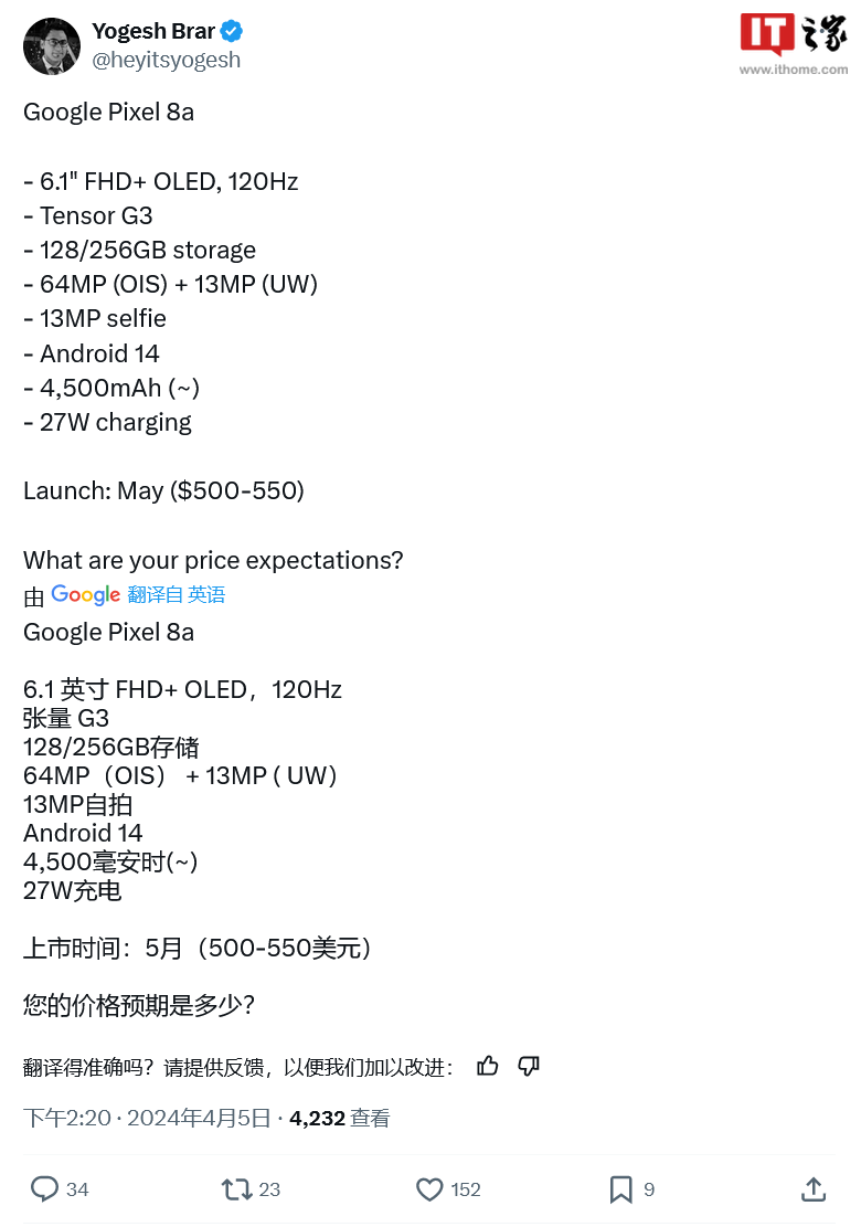 IT之家 4 月 7 日消息,谷歌此前发布的中端手机 Pixel 7a 广受好评,随着即将到来的 Google I / O 开发者大会临近,人们的注意力也逐渐转向了即将发布的 Pixel 8a 系列新品。
