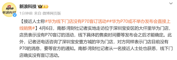 据南都·湾财社公布的消息,其记者通过走访位于深圳宝安区的大仟里华为门店后得知,店员表示没有P70盲订的活动,线下具体的售卖时间要等发布会之后才能确定。此外,记者还电话咨询了深圳宝安壹方城的华为门店,对方同样表示门店目前没有P70的消息,要等官方的通知。南都·湾财社记者从一名接近人士处也获悉,线下门店确实没有盲订活动。