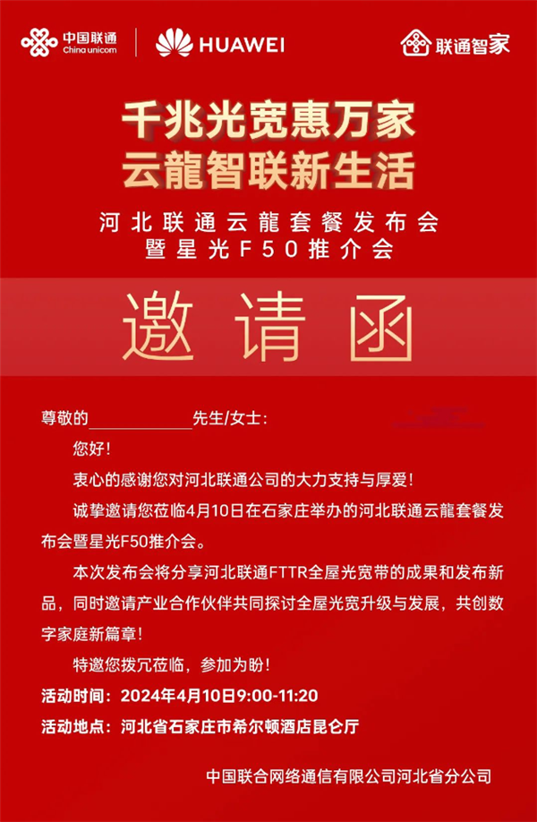 快科技4月9日消息,河北联通将联合华为,明日举行河北联通云龍套餐暨星光F50推介会,面向广大河北家庭用户正式推出云龍套餐。