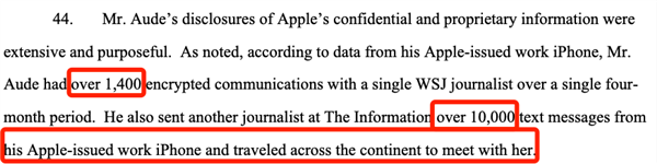 按照苹果的指证,他和华尔街日报、 The information 这些大媒体记者的关系相当密切,光去年 6 月 -9 月的 4 个月里,给华尔街日报记者又是电话、又是短信联系了 1400 多次。