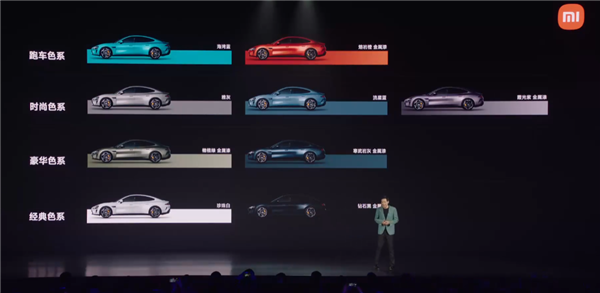 小米SU7首发共有9种颜色可选,包括海湾蓝、溶岩橙、雅灰、流星蓝、霞光紫、橄榄绿、寒武岩灰、珍珠白和钻石黑。