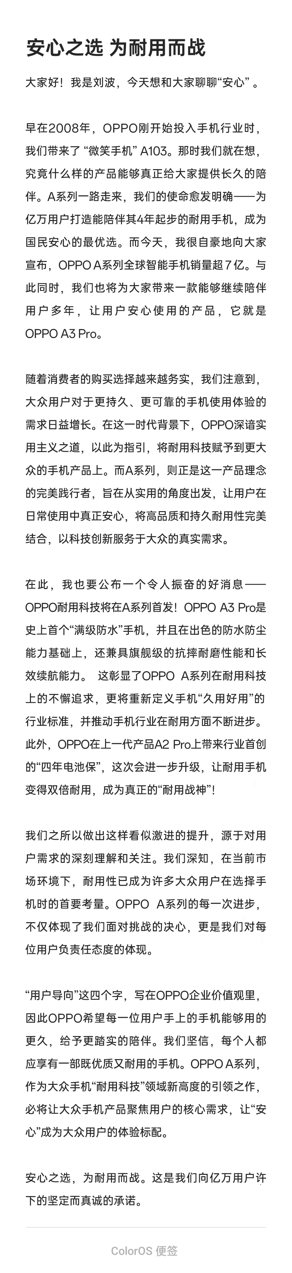 刘波表示:OPPO A 系列全球智能手机销量超 7 亿。OPPO 耐用科技将在 A 系列首发,OPPO A3 Pro 是史上首个“满级防水”手机,兼具旗舰级的抗摔耐磨性能和长效续航能力。此外,OPPO 在上一代产品 A2 Pro 上带来行业首创的“四年电池保”,这次会进一步升级,让耐用手机变得双倍耐用。