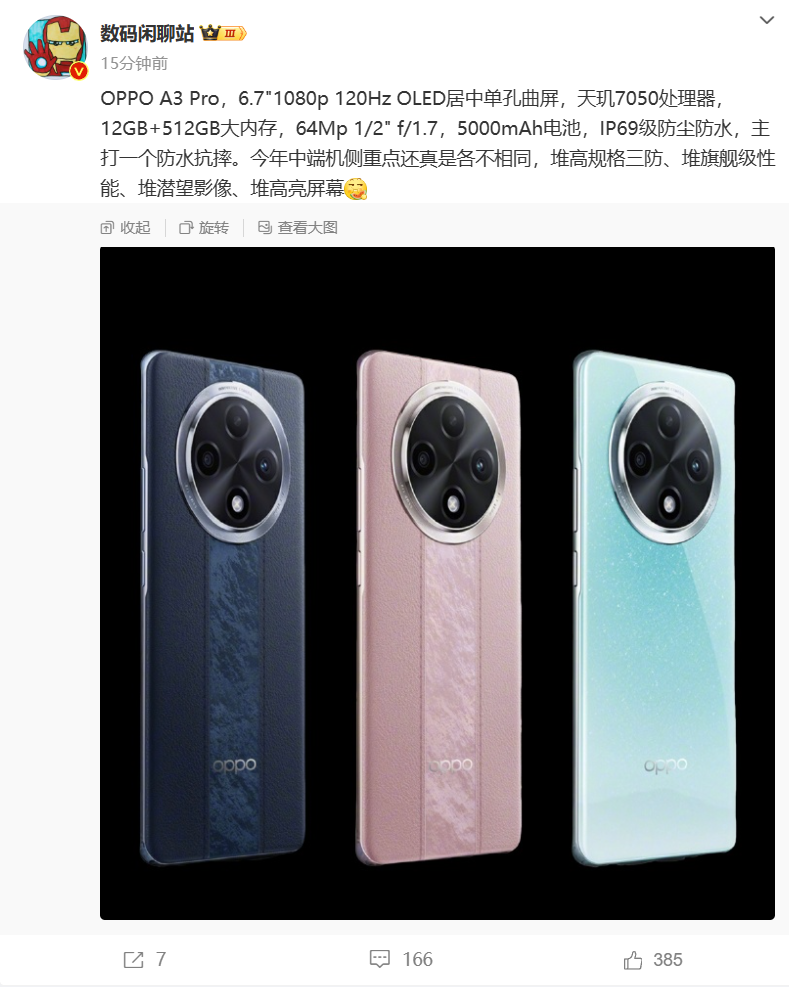 配置方面,博主 @数码闲聊站 透露,OPPO A3 Pro 搭载天玑 7050 处理器、12GB + 512GB 存储,配有 6.7 英寸 1080p 120Hz OLED 居中单孔曲屏,以及 64MP 1/2 英寸 f / 1.7 主摄、5000mAh 电池。