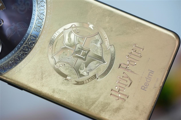 机身下半部分承袭霍格沃茨学校徽标的精髓,Redmi运用魔法级的铂金立体浮雕工艺,通过三层图案的巧妙叠加,结合八种纹理工艺,勾勒出黑魔法魂器与光明的交织故事。