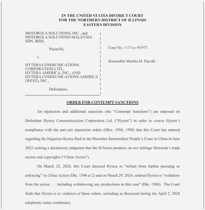 据悉,这份全球范围内的销售禁令从2024年4月2日起生效,直至另行发布法令为止,禁止海能达及关联的一切销售渠道,在全球范围内提供销售、进口、出口或分销任何对讲机技术相关的产品。此外,该制裁令还要求海能达遵守相关反诉禁令前,必须在全球范围内停售含有双向无线电通信技术的产品,并每日向法庭缴纳罚金100万美元。