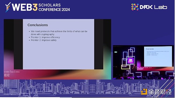 其中之一就是继续提高效率, 我们想要实时证明一切。 我们希望看到这样一个世界:在去中心化协议的区块中传递的每条消息默认都附加有ZK-SNARKS,证明该消息以及该消息所依赖的所有内容都遵循协议的规则。 我们如何才能提高效率以实现这一目标? 第二个是提高安全性。 从根本上减少出现问题的可能性,让我们进入一个世界,在这个世界中,这些协议背后的实际技术可以是非常强大和非常值得信赖的。