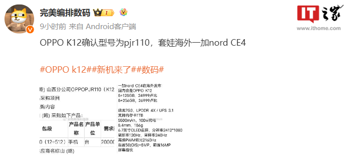 IT之家 4 月 8 日消息,此前有一款型号为 PJR110 的 OPPO 新机在工信部完成入网,但并不确定官方名称。据博主 @完美编排数码 最新透露,这款新品为 OPPO K12 手机,可以参考海外发布的一加 Nord CE 4 手机。