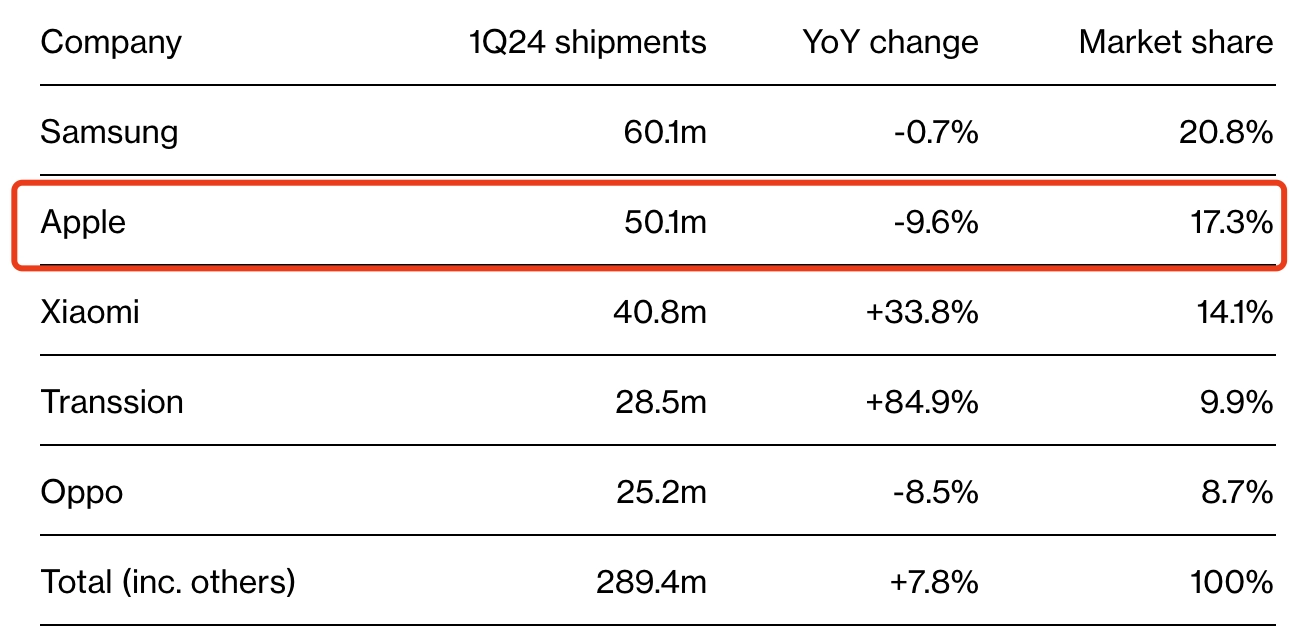 与此同时,iPhone 销量也在下滑。知名研究公司 IDC 发布报告称,尽管第一季度全球整体手机销量同比增长 8%,但 iPhone 销量同比下滑 10%。